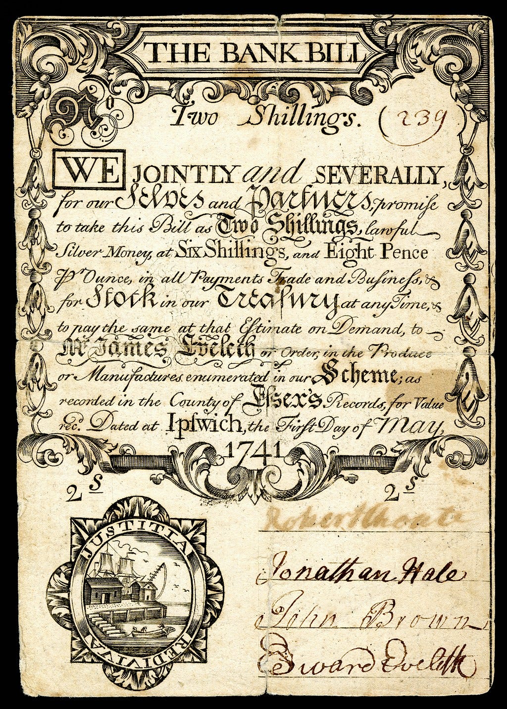 Massachusetts decided to press on; in 1716, it formed a government “land bank” and issued £100,000 in notes to be loaned on real estate in the various counties of the province.